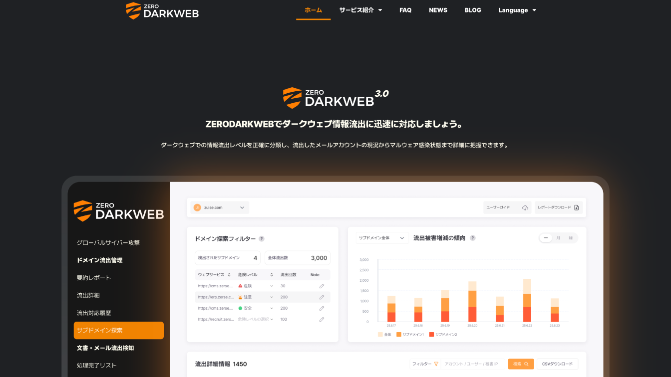2024年より提供されている、国内企業の運用に最適化されたサービスで、ダークウェブ上に自社のメールアドレスやパスワードなどが流通していないかを、24時間365日体制で継続的に監視します。