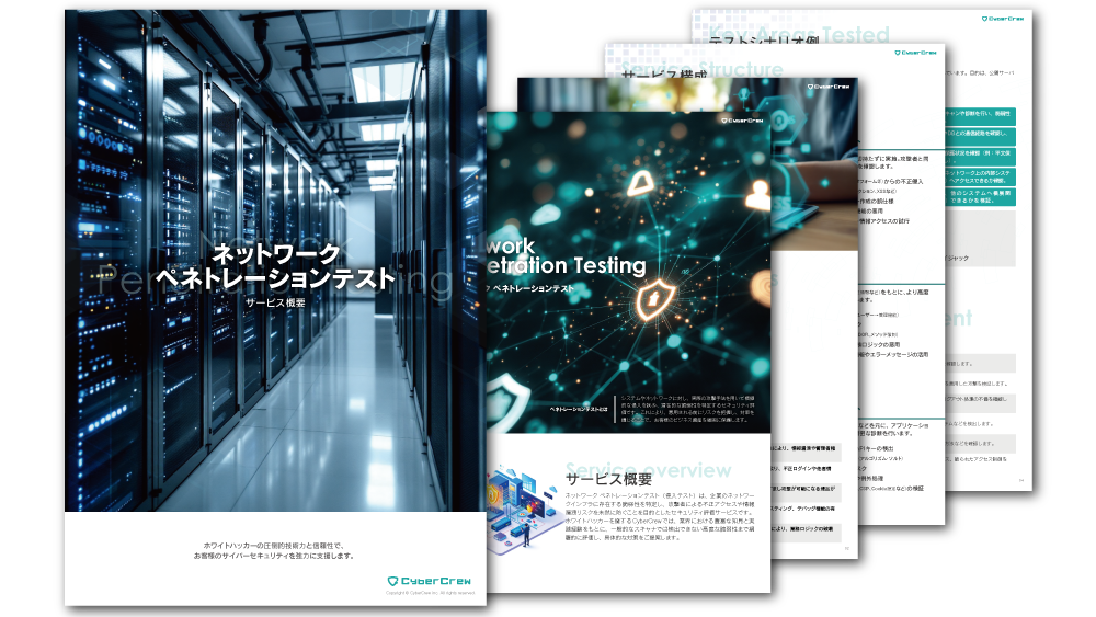 ホーム » ダウンロードコンテンツ » 【サービス案内】ネットワークペネトレーションテスト【サービス案内】ネットワークペネトレーションテスト2025.09.04by CyberCrew ネットワークペネトレーションテストに関する技術仕様から金額・プランまでをご案内した資料になります。 サービス概要 対応基準・ガイドライン 主な脆弱性とリスクの例 サービス構成 テストシナリオ例 主な検査対象領域 テスト実施の効果 レポート納品内容 サービスご利用例・費用 テスト実施の流れ 前【サービス案内】 クラウドペネトレーションテスト次【サービス案内】ソーシャルエンジニアリングテスト