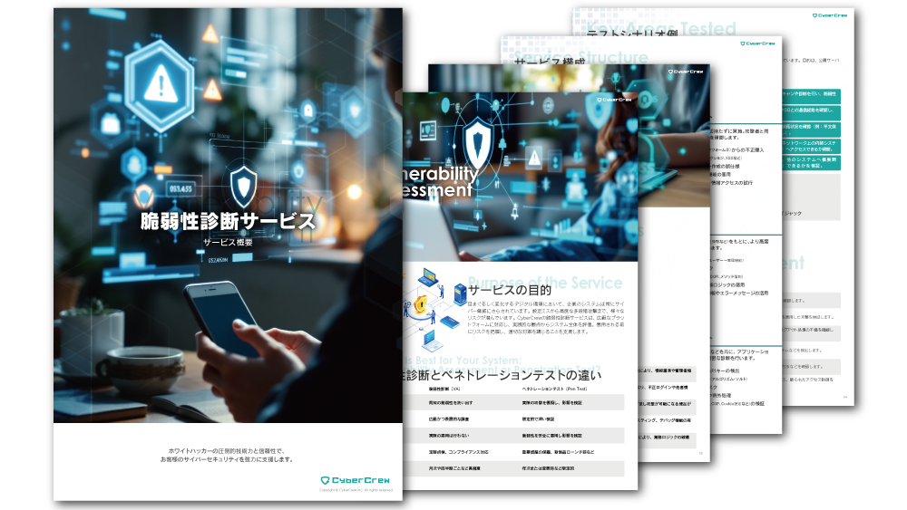ホーム » ダウンロードコンテンツ » 【サービス案内】脆弱性診断【サービス案内】脆弱性診断2025.09.04by CyberCrew 脆弱性診断に関する技術仕様から金額・プランまでをご案内した資料になります。 サービスの目的 脆弱性診断とペネトレーションテストの違い 対応基準・ガイドライン 主な脆弱性とリスクの例 サービス構成 テストシナリオ例 主な検査対象領域 テスト実施の効果 レポート納品内容 サービスご利用例・費用 テスト実施の流れ 前【サービス案内】ソーシャルエンジニアリングテスト