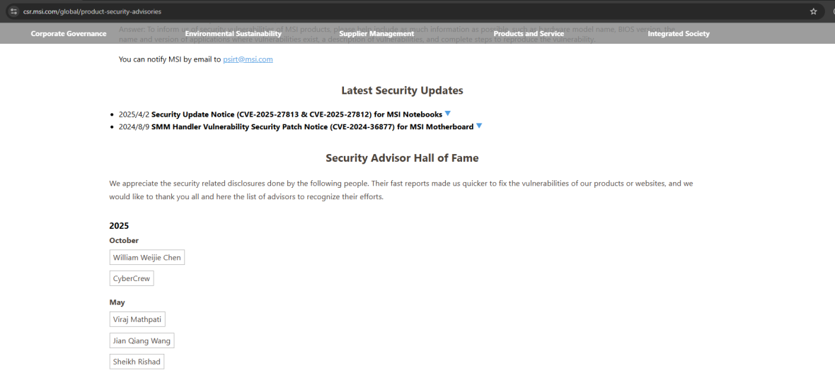 ▼MIS社 Security Advisory ページ : https://csr.msi.com/global/product-security-advisories
