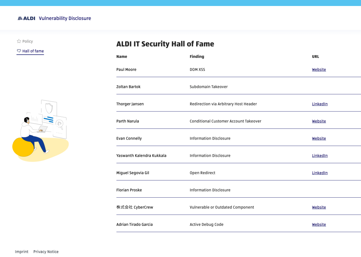 ALDI SOUTH GroupのVulnerability Disclosure Policyでは、善意に基づく責任ある脆弱性報告を重視しており、対象となる脆弱性を最初に報告し、かつ修正に至ったセキュリティ研究者については、Hall of Fameでその貢献を公表するとしています。