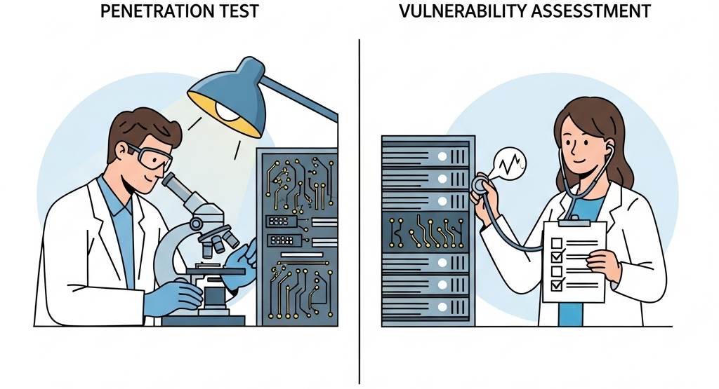 類似の手法として脆弱性診断があります。どちらもセキュリティを強化する手法ですが、目的とアプローチが異なります。よく「健康診断」と「精密検査」に例えられます。