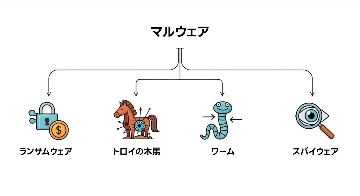 • マルウェア:悪意あるソフトウェアの総称(最上位概念)