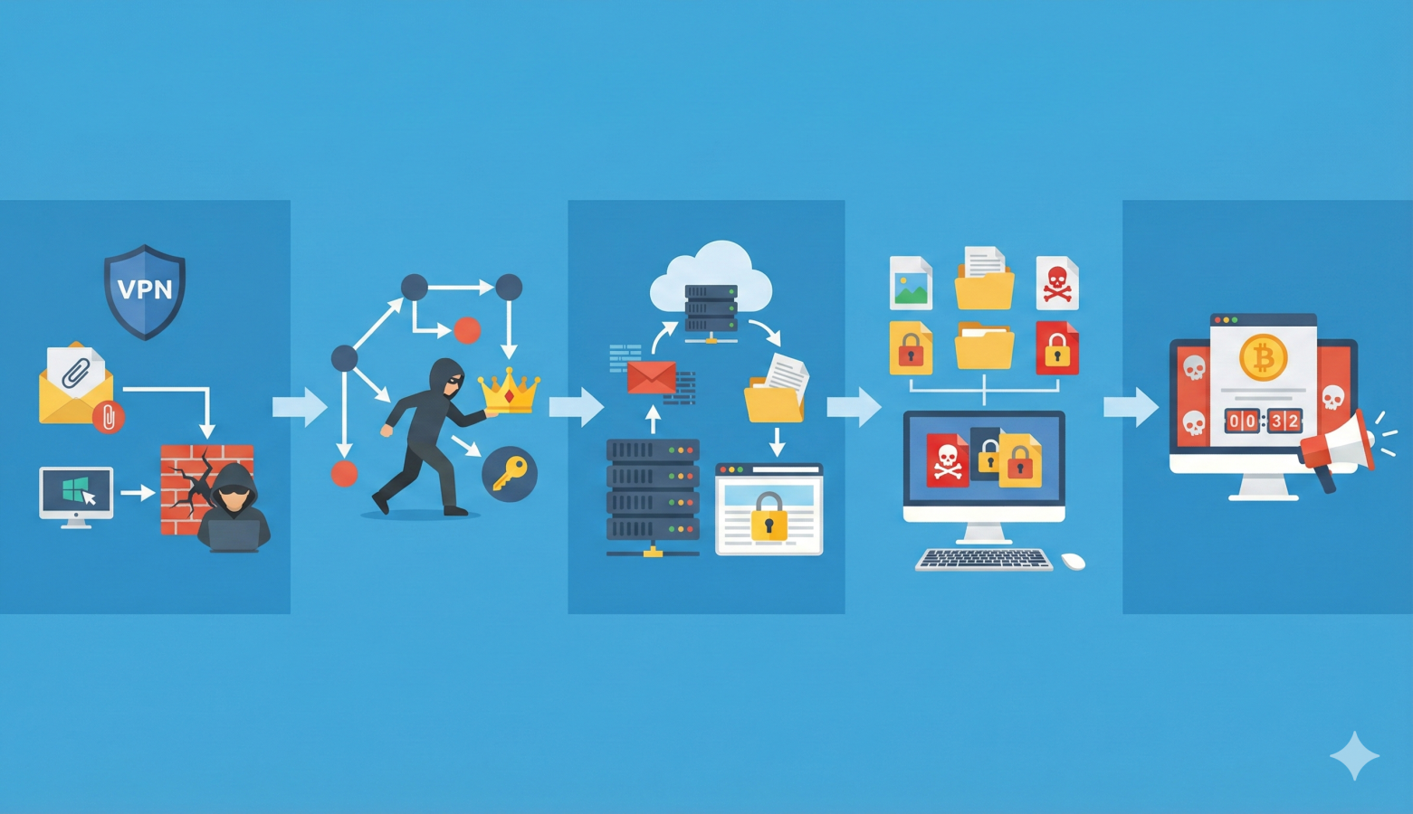 実際には、VPN・リモートアクセス・外部公開サーバなどの“入口の穴”から侵入し、社内で認証情報を集めて権限を奪い、横展開してから最後に暗号化する――という段階的な流れで進むことが多いです。