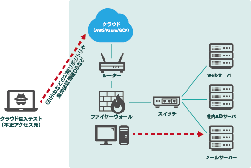 本シナリオでは、インターネット上のクラウドサービスを経由し、設定ミスや脆弱な認証によって企業ネットワーク内部への侵入が可能かを検証 します。特に、外部に公開されたクラウドリソースからメールサーバやWebサーバなどの重要システムにアクセスできるかを評価します。