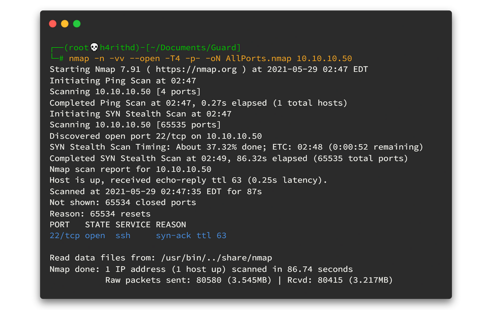 nmap -n -vv --open -T4 -p- -oN AllPorts.nmap 10.10.10.50