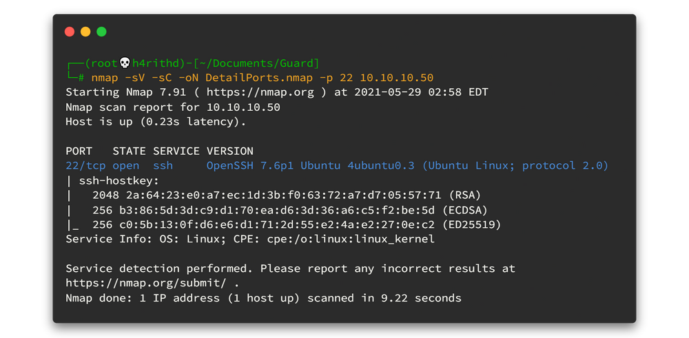 nmap -sV -sC -oN DetailPorts.nmap -p 22 10.10.10.50