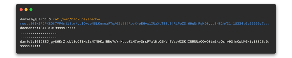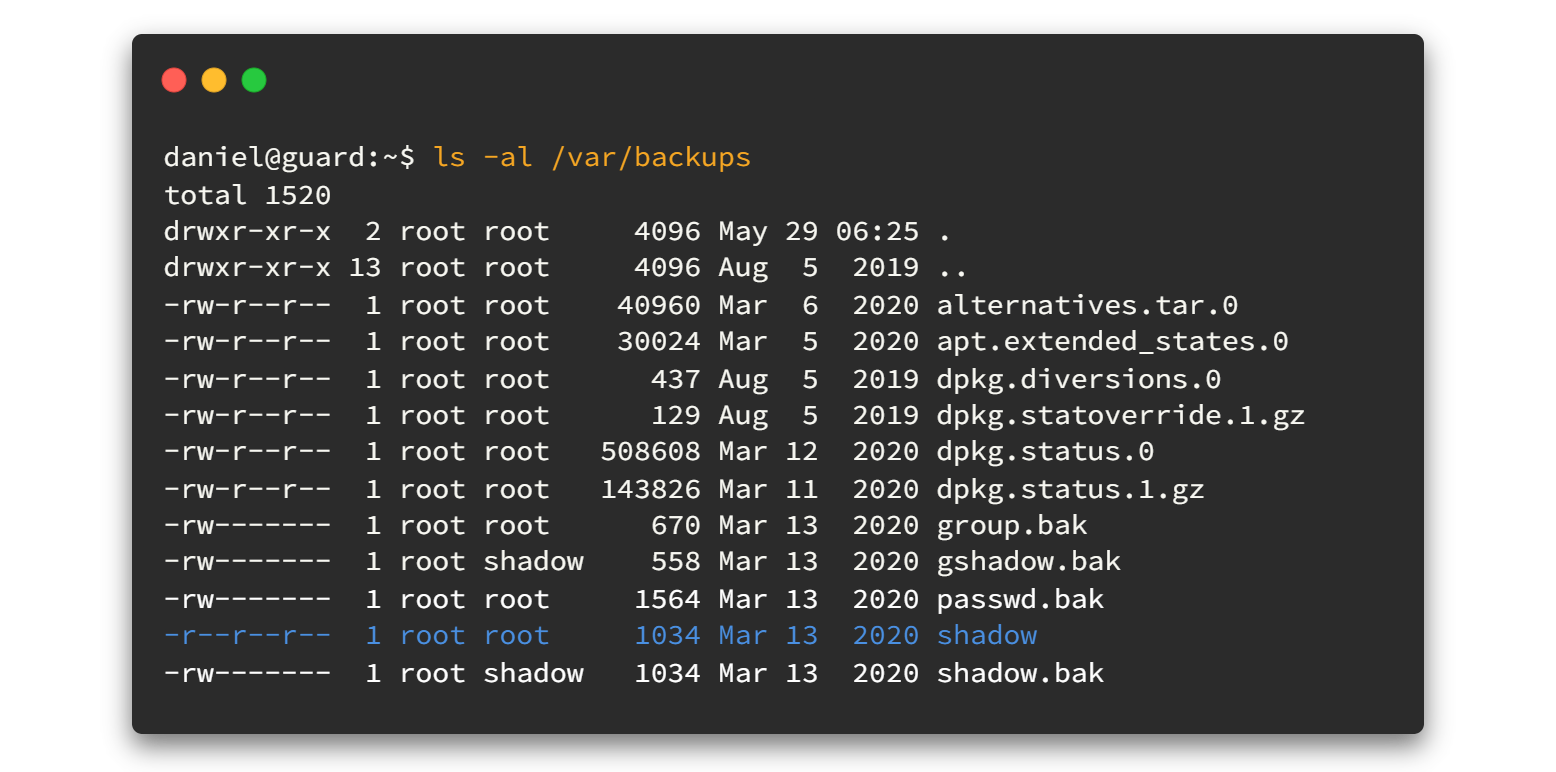 システムを確認すると、/var/backups ディレクトリに shadow ファイルのバックアップが存在し、読み取り可能であることが判明しました。