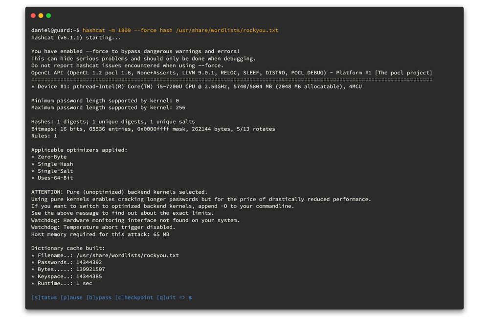 hashcat -m 1800 --force hash /usr/share/wordlists/rockyou.txt