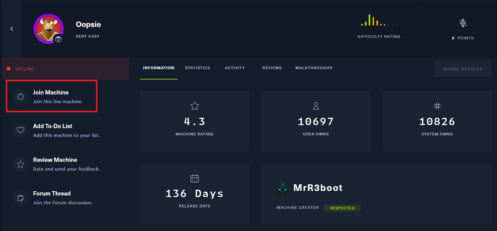 まず、HTB のインターフェースで「Join Machine」をクリックしてマシンを起動します。