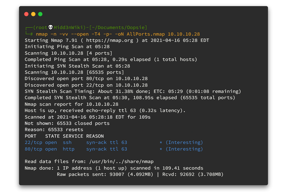 nmap -n -vv --open -T4 -p- -oN AllPorts.nmap 10.10.10.28