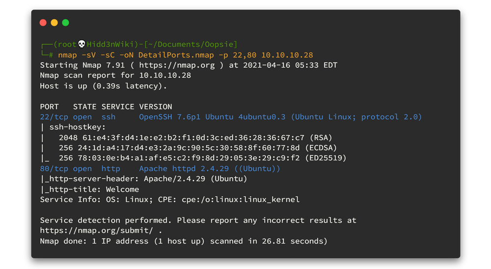 nmap -sV -sC -oN DetailPorts.nmap -p 22,80 10.10.10.28