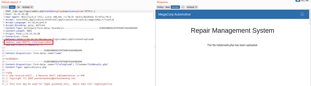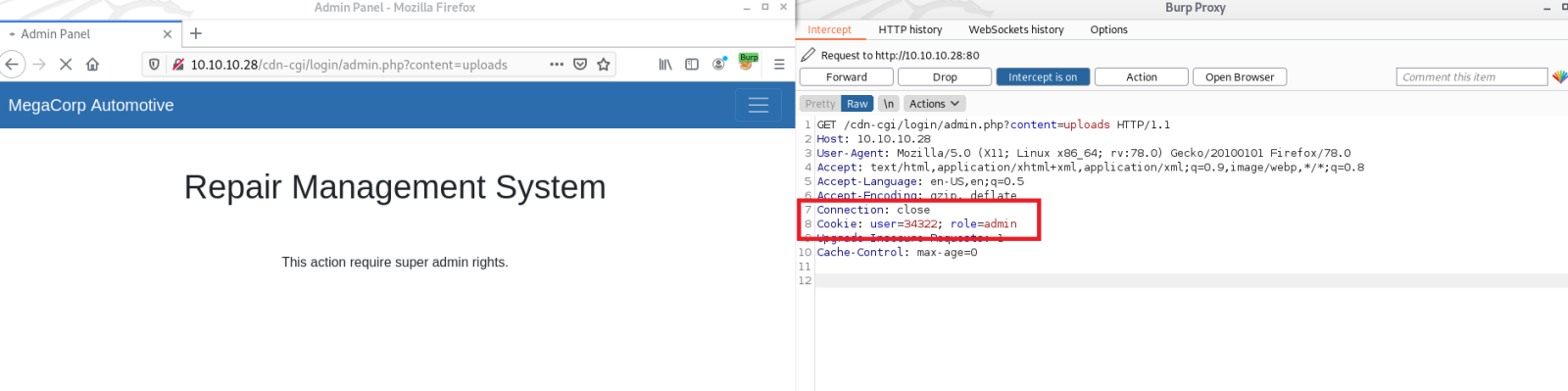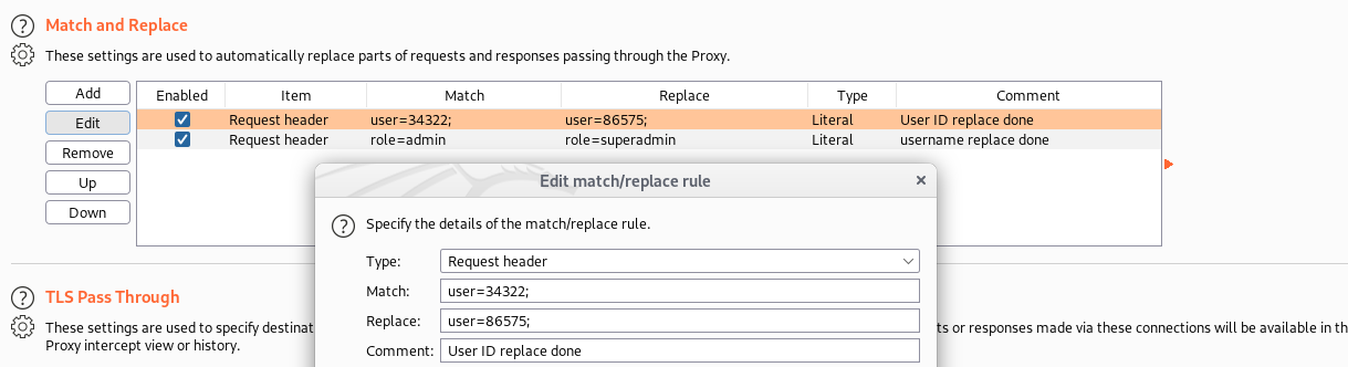 Burp Proxy の「Match and Replace」機能を使って Cookie の user_id や role の値を SuperAdmin に書き換え、リクエストを転送します。
