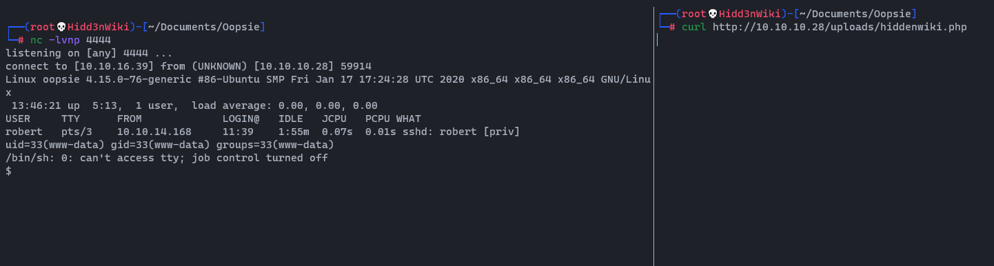 攻撃側で netcat を起動してリバースシェルを待ち受けると、www-data 権限のシェルが得られます。