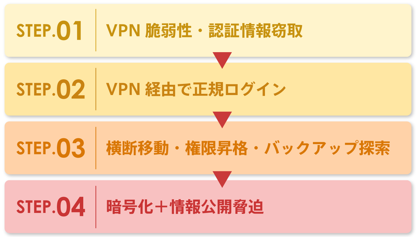 Webサイト改ざんのような単発の被害では済まず、認証情報の窃取、横展開、バックアップ破壊、業務停止まで連鎖しやすいのが特徴です。